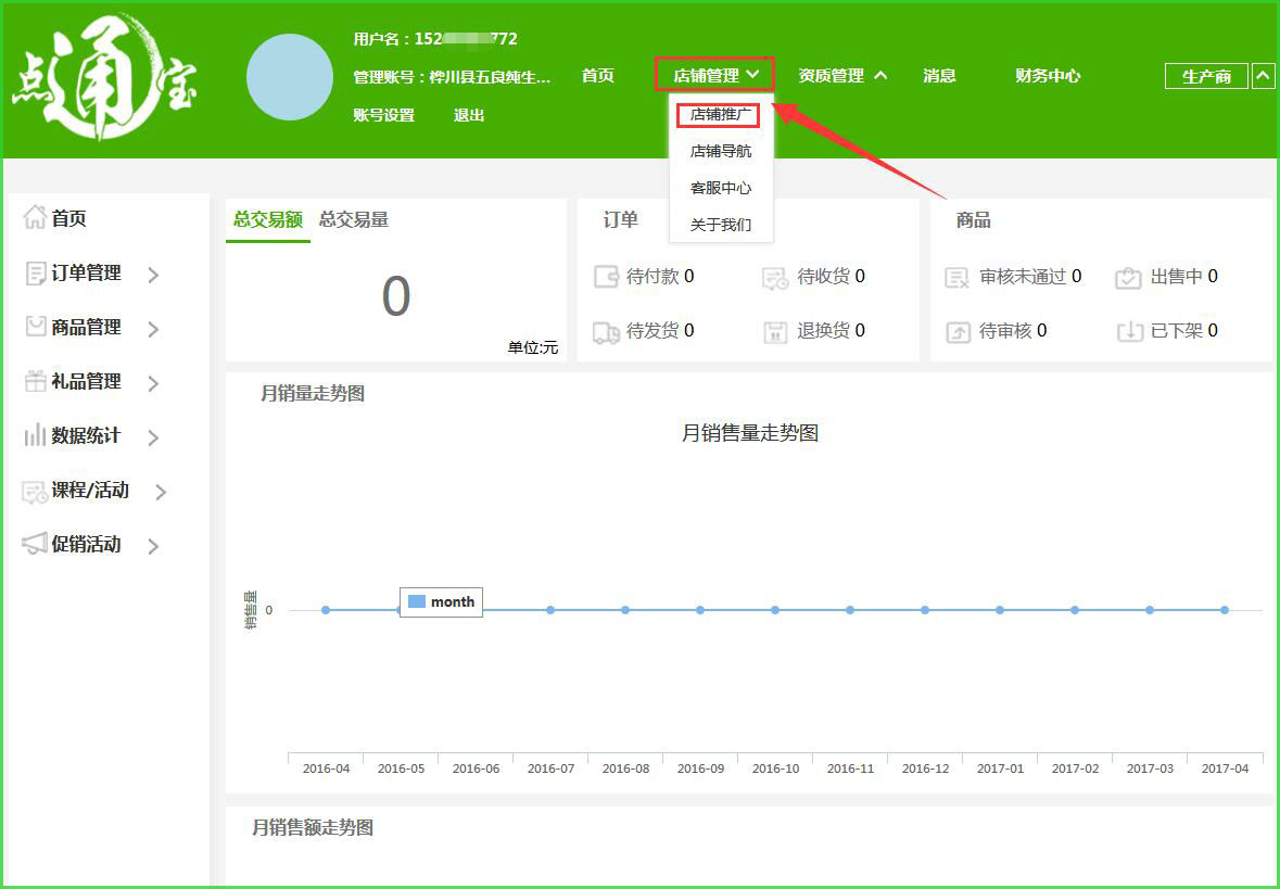 登录商家后台首页后,点击“店铺管理”,点击“店铺推广”