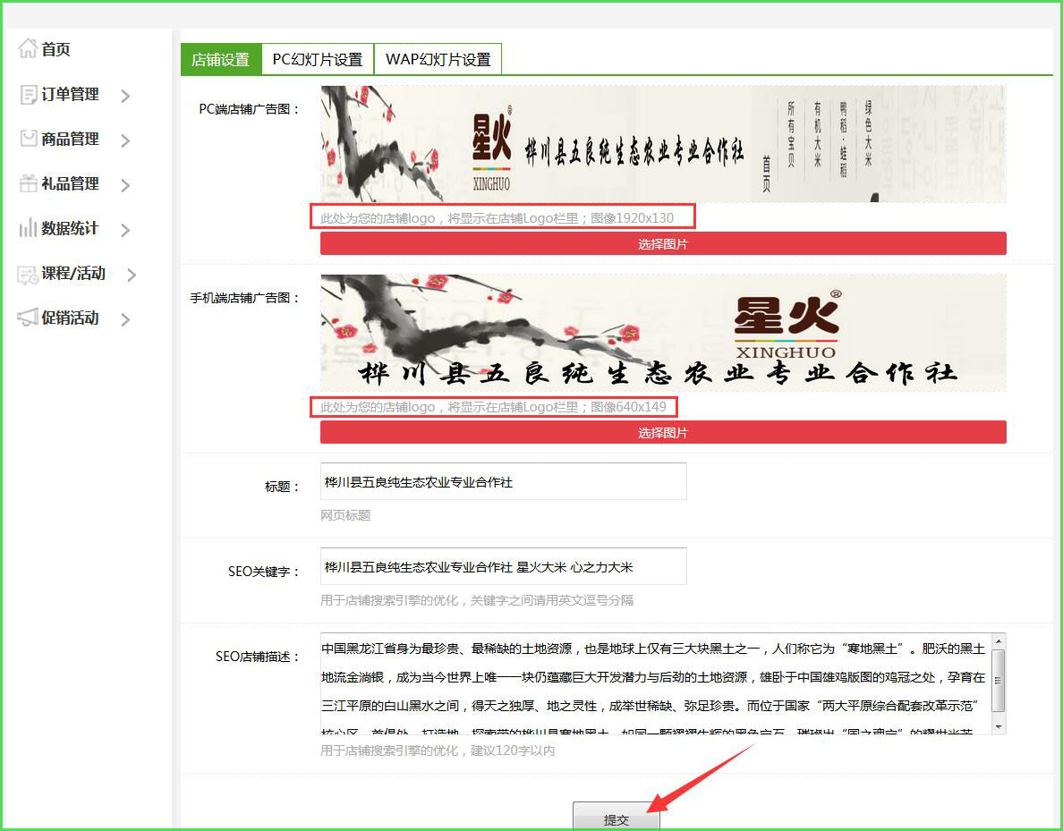 在店铺设置页面中根据提示尺寸制作并上传logo图片,PC端logo:1920x130,手机logo:640x149(若不按比例尺寸,则上传的图片会变形)