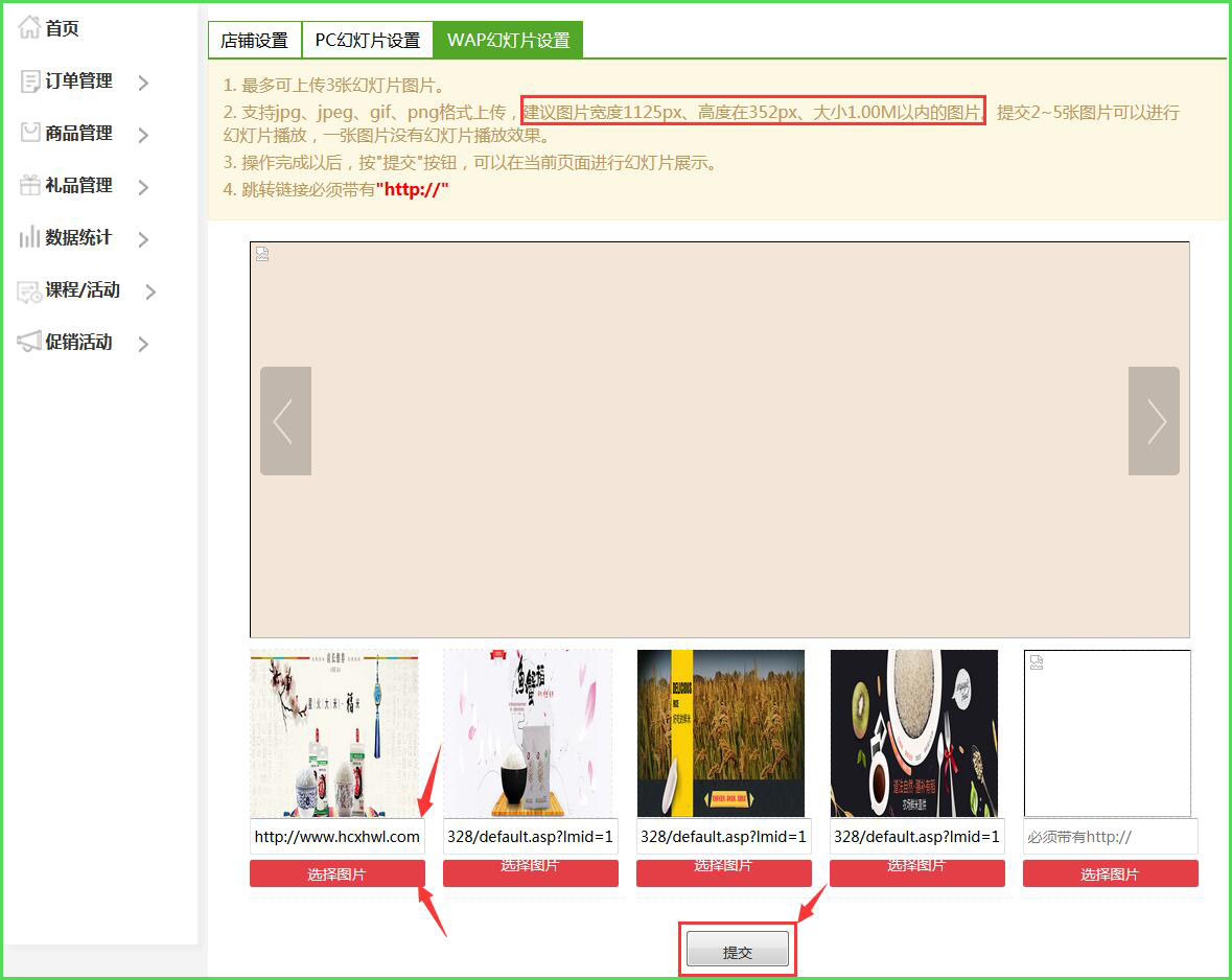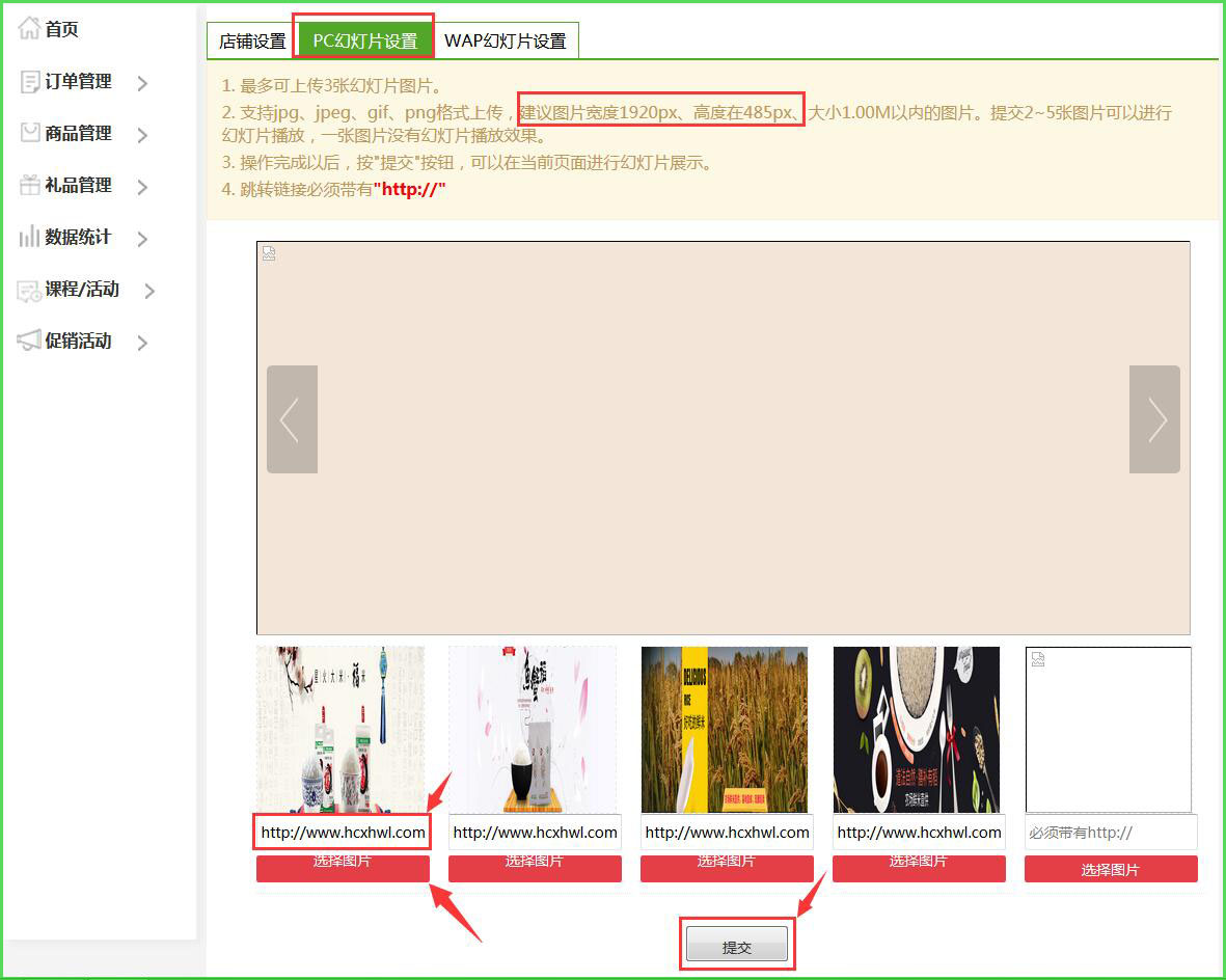 制作2-5张店铺幻灯片(广告图、banner图)尺寸为1920x485;点击“选择图片”进行添加,可在每张幻灯片下方填写公司网站。