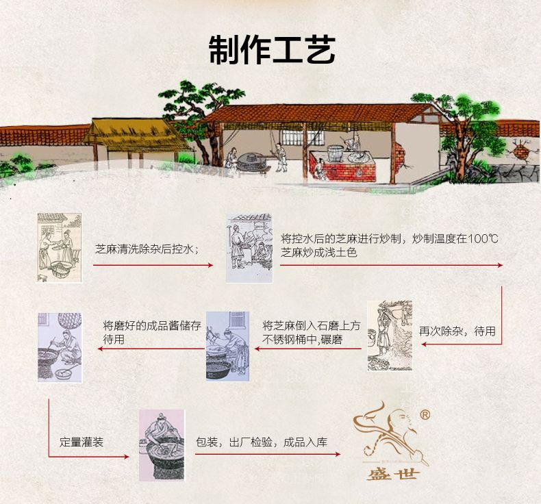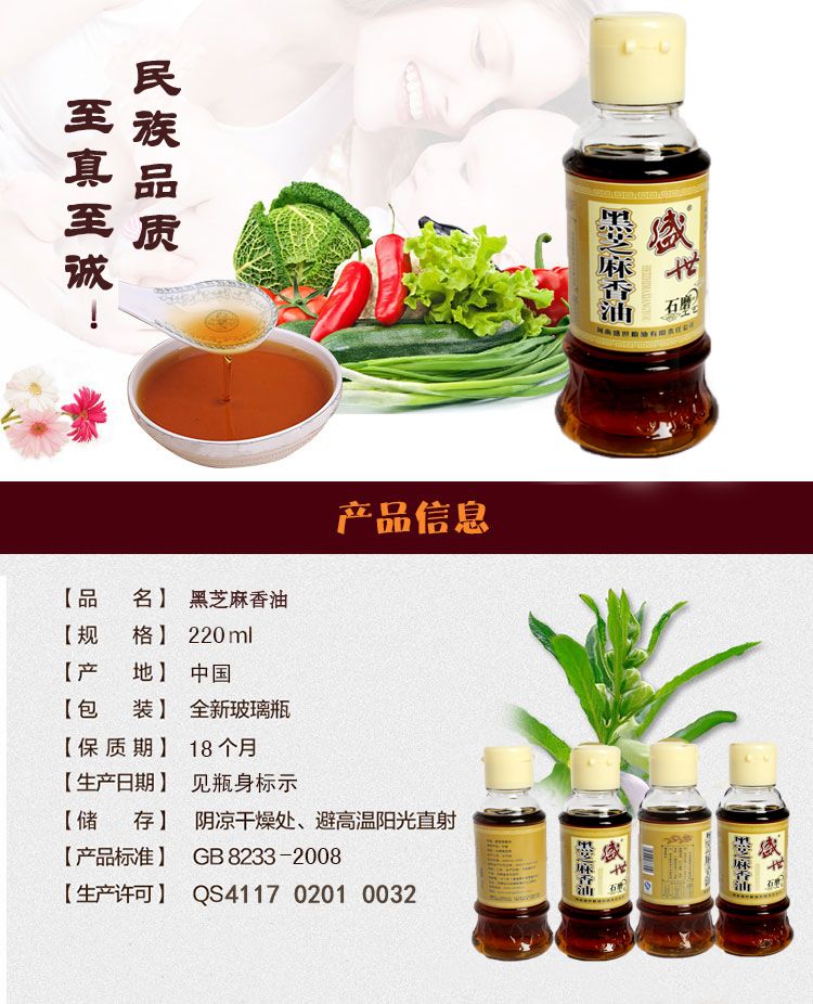 芝麻油的加工工艺分为三种:石磨工艺(又叫水代法)、压榨工艺和浸出工艺。其中压榨工艺和浸出工艺都是现代化的生产方式,这两种工艺的优点是:现代生产工艺产量大、出油率高、生产效率高,成本低。但是它的缺点是无法保持香油的传统香味,而石磨工艺加工效率低,生产成本高,但是却完整的保存了芝麻香油的醇厚香味,其加工温度不超过100℃,具有“回味醇厚、齿颊留香”的特点。我们盛世牌香油为了保证香味的浓郁和持久,所有产品均采用石磨工艺。