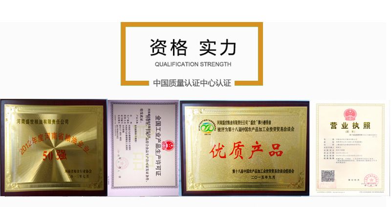我们盛世牌香油的主旨即是把驻马店香油推向全国市场,打造一个全国知名的品牌,因此我们在质量的控制上是不遗余力的,公司先后通过了ISO9001:2008国际质量管理体系认证、ISO22000:2005国际食品安全管理体系认证、农业部无公害农产品认证,所以在小磨香油生产行业,我们公司的产品质量一直是一流的,而且我们公司主要服务于一些高端客户,很多对质量要求非常严格的大的集团公司都是我们的客户,因此我们的产品质量是完全信得过的。