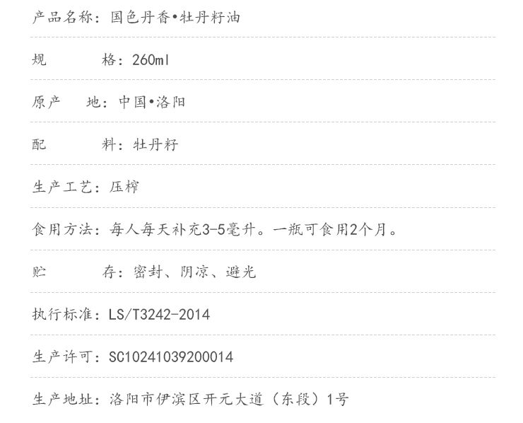 【国色丹香】牡丹籽油 260mL/瓶 家庭实惠装 洛阳特产 低温压榨 营养丰富