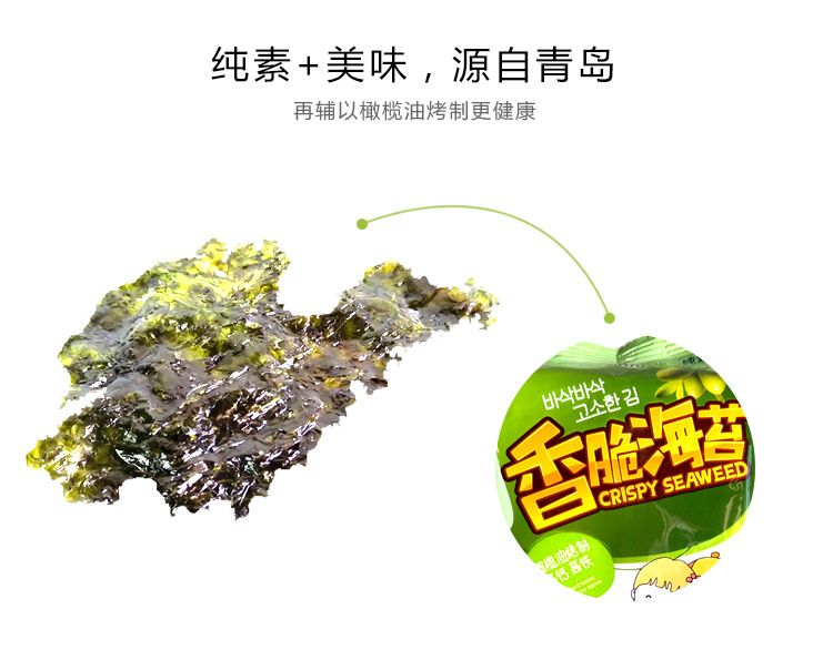 香脆海苔橄榄油匠造,以传统工艺,烹制鲜脆美味,愉悦心灵,妙不可言,无添加防腐剂、无添加人工色素、无添加人工甜味剂。