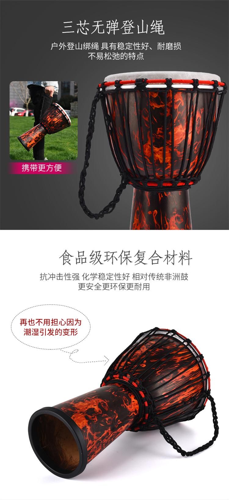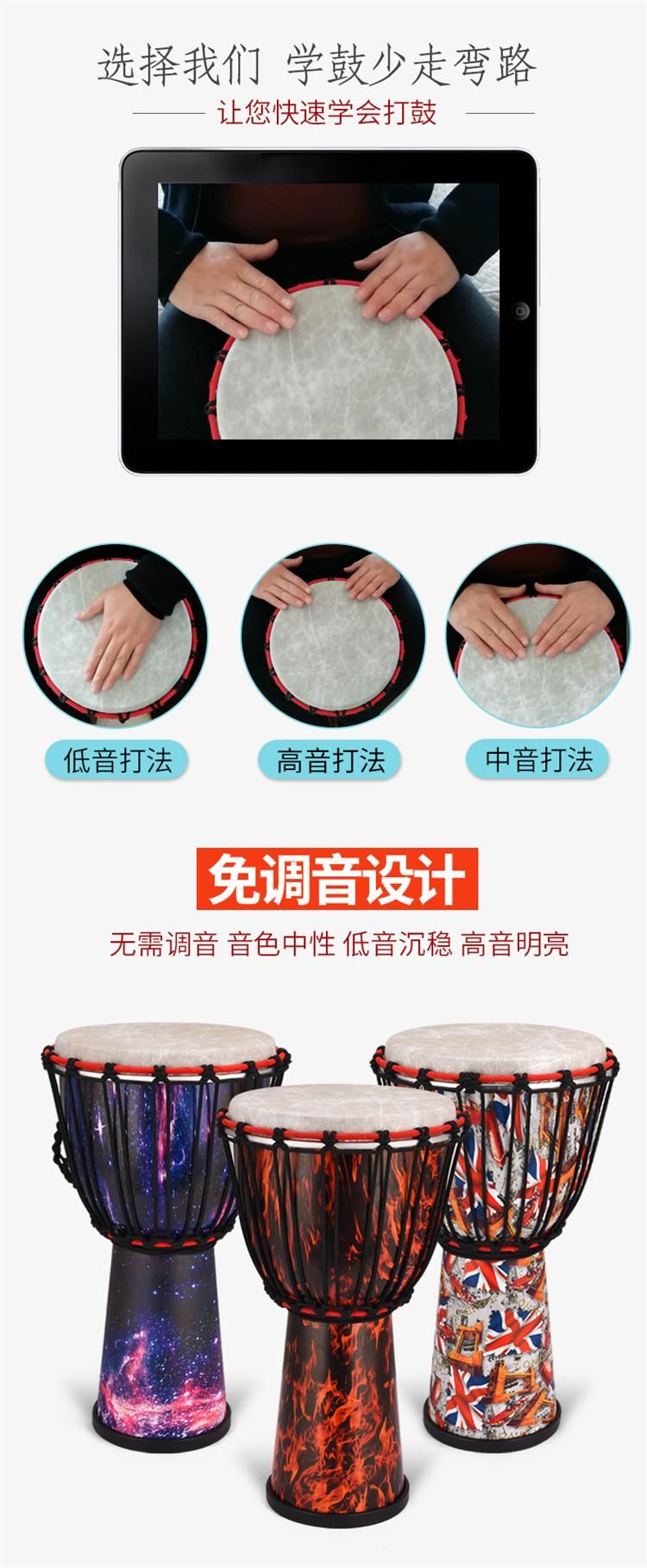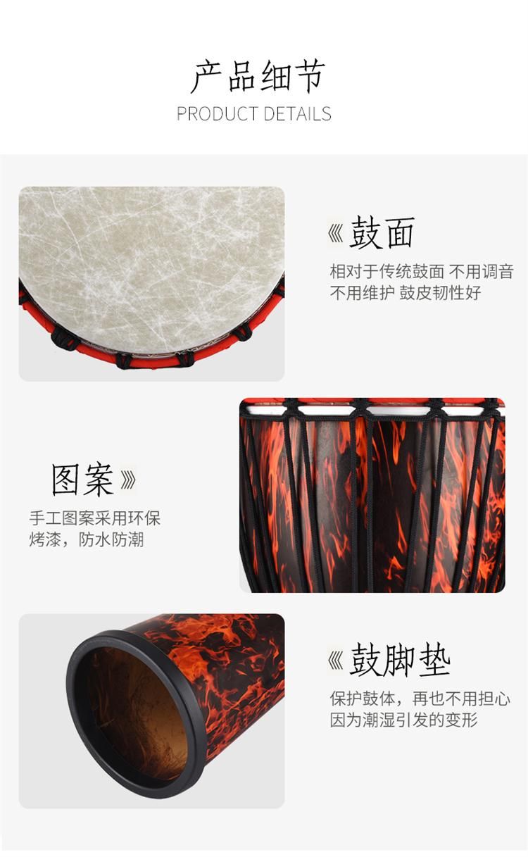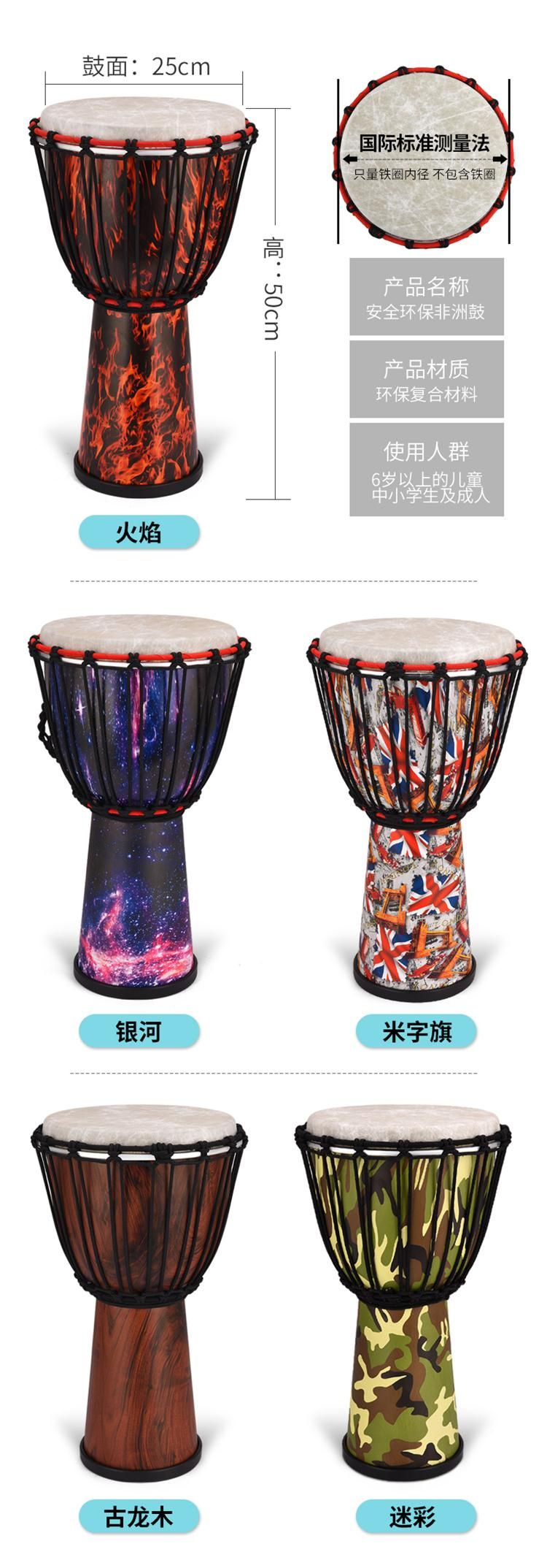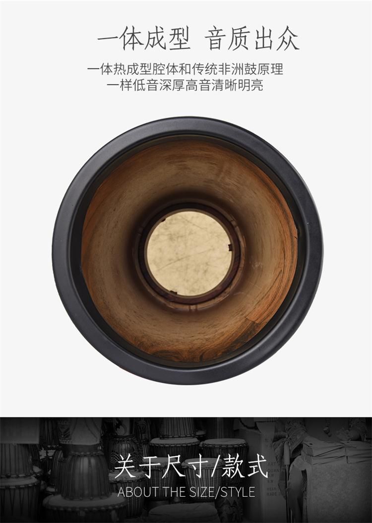EMI牌非洲鼓,标准10寸。鼓腔:高科技复合材料,耐打、耐摔、耐潮,不受环境影响,鼓皮:合成纤维仿兽皮,鼓高:50厘米,鼓面:25厘米。鼓净重:2.6公斤。本产品不受温度、湿度影响,实木鼓在南方地区会发霉,鼓皮容易松,北方地区干燥,木头容易开裂,鼓皮容易炸皮,会影响使用和音色。EMI牌非洲鼓不受环境影响。使用须知:切勿长时间暴晒,非洲鼓是用手指和手掌敲击,切不可用其他物体或尖锐东西敲击鼓面。