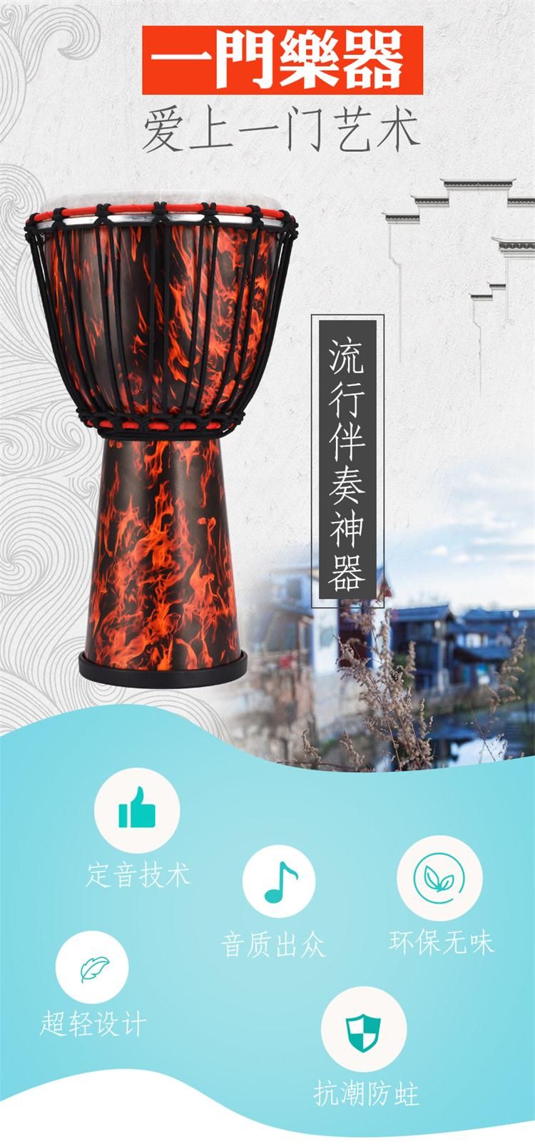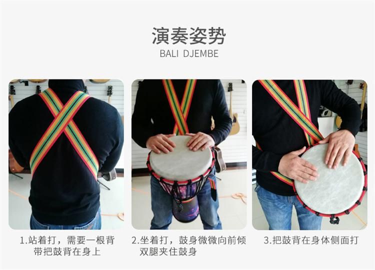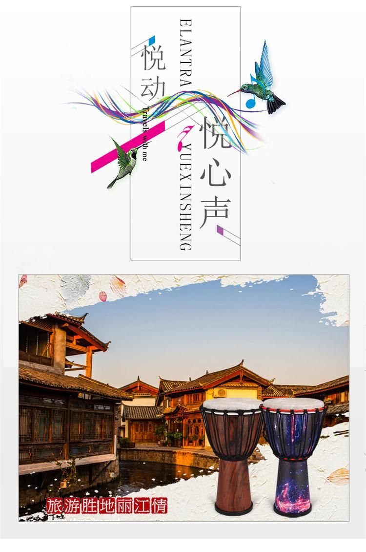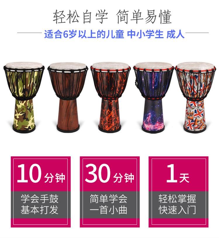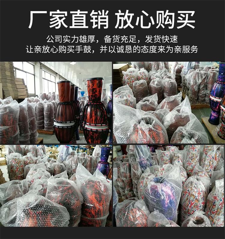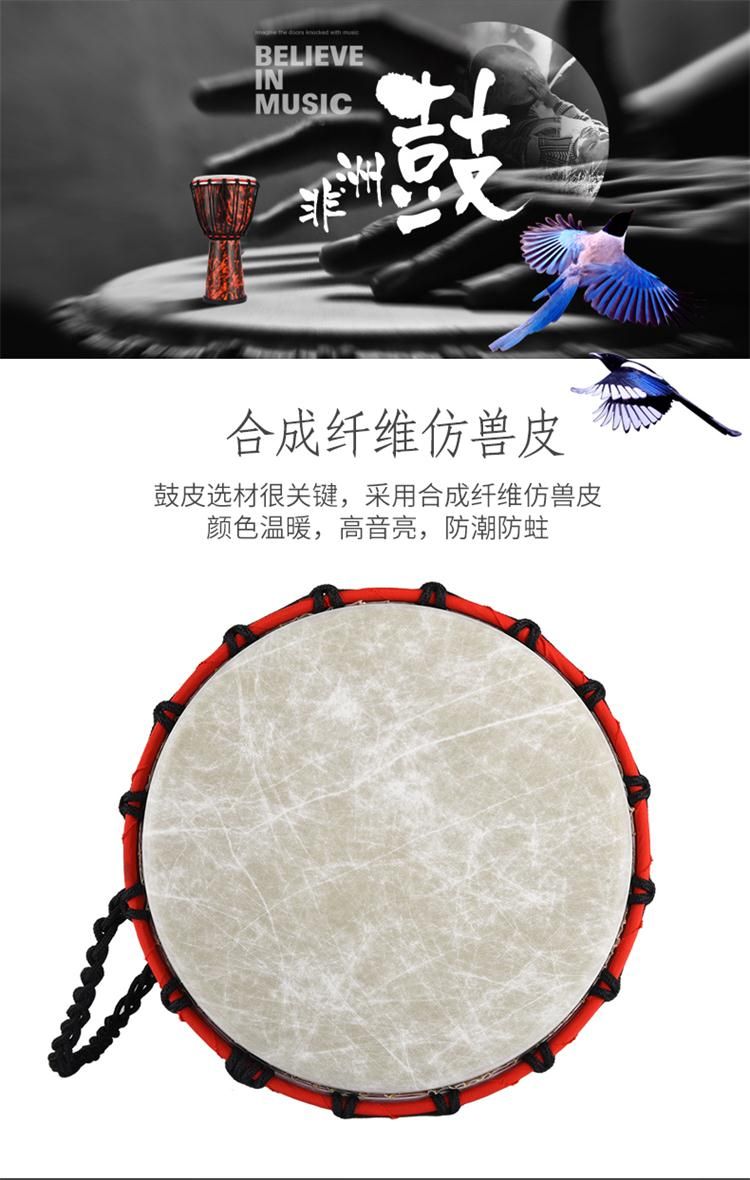 EMI牌非洲鼓,标准10寸。鼓腔:高科技复合材料,耐打、耐摔、耐潮,不受环境影响,鼓皮:合成纤维仿兽皮,鼓高:50厘米,鼓面:25厘米。鼓净重:2.6公斤。本产品不受温度、湿度影响,实木鼓在南方地区会发霉,鼓皮容易松,北方地区干燥,木头容易开裂,鼓皮容易炸皮,会影响使用和音色。EMI牌非洲鼓不受环境影响。使用须知:切勿长时间暴晒,非洲鼓是用手指和手掌敲击,切不可用其他物体或尖锐东西敲击鼓面。