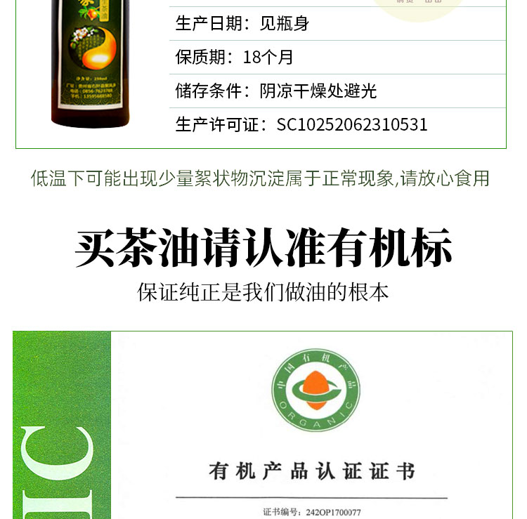 【大三湘】原香有机山茶油 245ml/瓶 冷榨冷提 原香原味