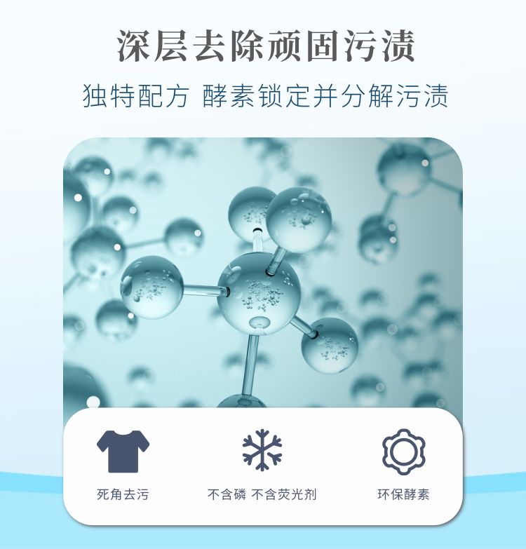 【2】独特配方达到国内一线日化水平,洁净效果达到国内一线水平,洗去纤维深层污渍,酵素锁定并分解污渍,轻松洗去污渍,轻松去除99种污渍。