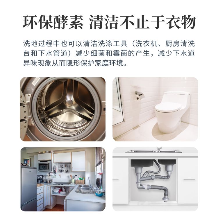 【3】洗涤过程中也可以清洁洗涤工具(洗衣机、厨房清洗台)和家庭地下管道,减少细菌和霉菌的产生,减少下水道异味臭味的现象从而保护隐形的家庭环境。